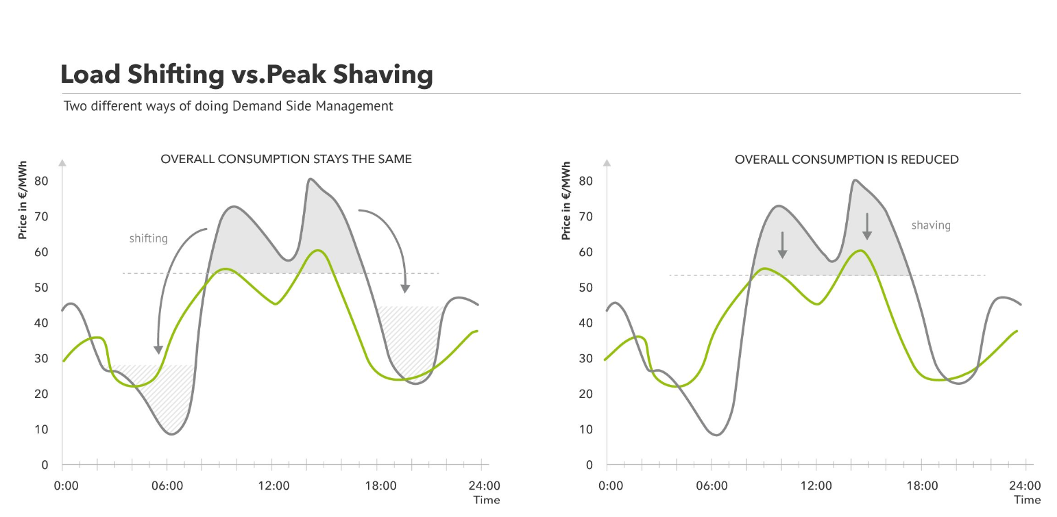 With peak shaving, a consumer reduces power consumption (“load shedding”) quickly and for a short period of time to avoid a spike in consumption. This is either possible by temporarily scaling down production, activating an on-site power generation system, or relying on a battery.